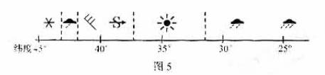图5为某日中国东部一条经线附近地区的天气状况示意图,读图,回到第7题。