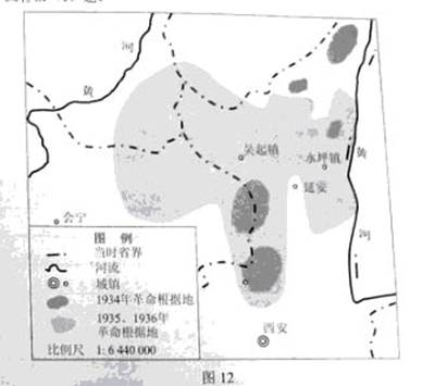 (1)描述1934年至1936年革命根据地分布范围变化的特点。(6分)