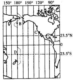 36.读图4,D地此时是一年中太阳高度最小的正午,此时一艘轮船从A地出发,航行6小时后到达B地,然后又继续航行10天,到达目的地C地(32°N)。分析回答以下各小题:(15分)