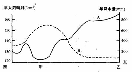 (1)图中表示年太阳辐射量的曲线是 ,造成甲地年太阳辐射量这种状况的原因是