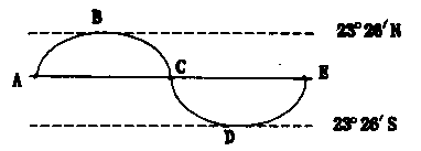 (6)当太阳直射点位于D点时,北京(39054′N)正午太阳高度角恰为