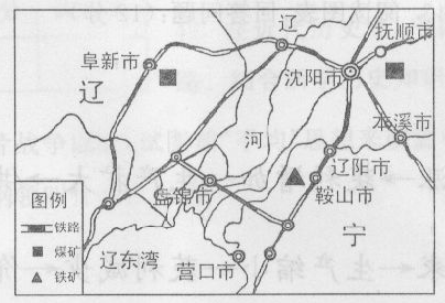 (2)读我国鞍山钢铁工业基地区位示意图,回答: