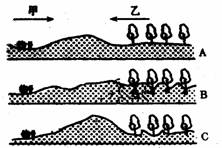 36.右面的三幅图为我国某沙区生物治沙示意图(右图),读图解答下面的问题。(17分)