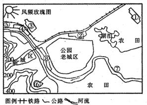 读某假想区域规划图,图中①-⑧点需规划高新工业区、港口、机场、水厂、城市绿化带、火电厂、污水处理厂、疗养区。回答52-53题。