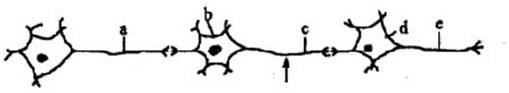 74. 下图表示三个突触连接的神经元。现于箭头处施加以强刺激,则能测到动作电位的位置是