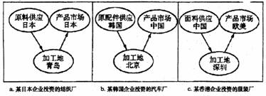 44.下图是三家企业投资建工厂的原料地、加工地和产品市场示意图,吸引三家企业在我国东部沿海地区三地投资办厂的最主要区位因素是