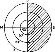 右图为某一时刻太阳高度等值线图,图中阴影部分为4月30日。读图完成7-8题