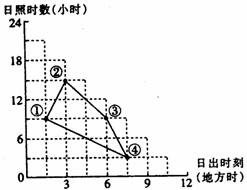 3.6月22日①②两地同时日出。9月23日当①地日落时,