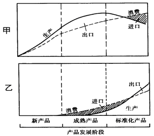 (3)比较甲、乙两类国家或地区在“成熟产品”阶段时生产与消费、产品进口与出口的关系。(4分)