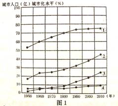 图中四条曲线分别代表发展中国家城市化水平、发达国家城市化水平、发展中国家城市人口和发达国家城市人口,它们对应的曲线分别是