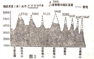 读西北--东南走向的某山脉地形剖面图,(图2),据此回答3~4题。
