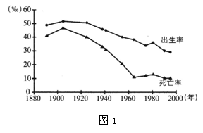 41.图1为某国人口出生率和死亡率统计图,该国人口自然增长率最高的时期是 ( )