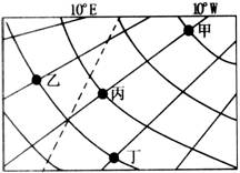 下图中两条经纬线之间的间距相等,虚线为昏线。读图回答1--3题