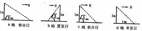 下图表示1米长标杆在a、b、c、d四个不同点,不同时间所测得的正午影长情况,判断37-39题。