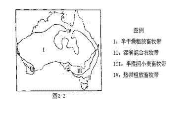 澳大利亚的平均海拔约350米。人口约2000万(2007年),绝大部分分布在东南沿海一带、广大内陆地区人口稀少。读“澳大利亚农牧业地带示意图”(图2-2),完成9---11题。