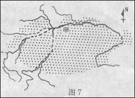 (2)图7所示甲河流中下游两岸地带是我国成片胡杨林的主要分布地。研究表明,胡杨的密度和树高随着离河岸距离增加而呈现降低的规律。试分析说明形成这种分布规律的主要原因。(10分)