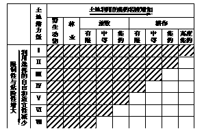 土地潜力评价是通过对土地自然要素相互作用表现出来的综合特征的评价,揭示土地生物生产力的高低和土地的潜在生产能力。图6为美国农业部土地潜力等级划分图(阴影为相应潜力级所适宜的利用范围)。读图完成9-10题。