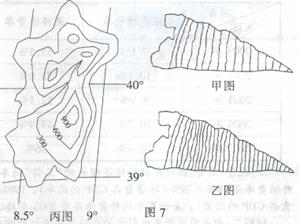 图7中,甲、乙两图表示生长环境不同的两块树木年轮截面的一部分;丙图表示某岛屿的等高线地形示意图。