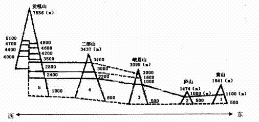 下图是我国300 N附近(即亚热带)的五座名山的垂直自然带比较图,读图回答44题。