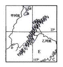 ⑴、据图分析E所在省的地形、地势特点。(6分)