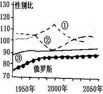 人口的性别结构是指一个国家或地区两性人口数量的比例关系,它通常由性别比这个指标加以度量。性别比为平均每100名女性所对应的男性人口的数量。图6为四个国家人口性别比例曲线,读图回答44-46题。