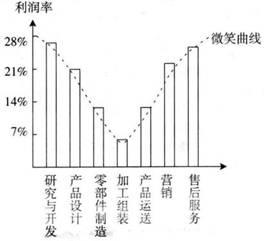 5.微笑曲线”(如图)表明:在产品的国际分工链条中,从研究开发、设计、零部件制造,到加工组装、营销等不同的环节,所获得的利润率不同。在广东省2007上半年的贸易出口总额中,大约65%属于为国外企业“贴牌”生产的加工贸易。为了爬上 “微笑曲线”的左边,广东省在对外贸易方面应该