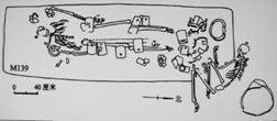 19、右图为福泉山良渚文化139号墓葬复原图。墓主为成年男性,口含玛瑙琀,身上分二行放置了12件武器石钺十分威武,足后有精美的彩绘陶器,而在墓坑外,一件祭祀用大口陶缸旁,有一具青年女性的骨架,人骨屈手屈腿,似跪着倒下的样子。下列选项能正确反映该图历史信息的是
