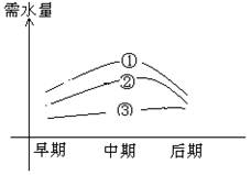 图-2为棉花、水稻、春小麦三种农作物在整个生长期的不同时段需水量相对大小比较,回答4-5题。