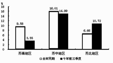 读江苏省2008年前三季度苏南、苏中、苏北地区能耗增长情况对比图(图-3),回答6-7题。