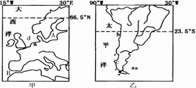 ⑴甲图中B海峡表层的洋流的成因类型为 ,流向是 。(4分)