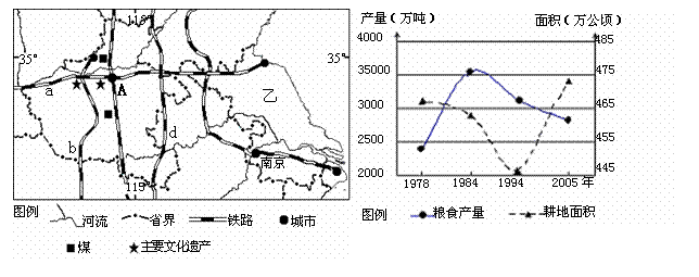 材料一:图1为我国局部地区图,图2是图1中乙省粮食产量、耕地面积变化图。