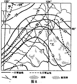 36.(36分)图8为我国某区域等温线图,表3为乙地区气候资料图,完成下列要求。