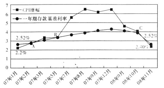 31.下图是我国近两年的消费者物价指数(CPI)和金融机构存款基准利率变化示意图,A、B、C三点是两条曲线的交点。根据下图所反映的储蓄存款收益变化状况,居民选择减少银行存款意愿较为强烈的时段是( )