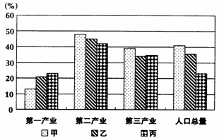 [解析]D 依据产业比例及人口总量比例特征可知甲、乙、丙分别为东部、中部和西部经济地带。