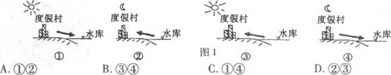 在水库及其周围,由于地面热容量的差异,导致了局部小气候的产生。读图1回答3-4题。