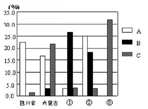 下图表示的是我国五个省级行政区的煤、石油和天然气三种矿物能源占全国总储量的比例。读图回答1-3题。
