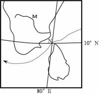 如图,中国某一远洋运输船舶沿着图中虚线航行,在阳光初露海面时刚好通过N地,此时收音机里正在播报北京时间8∶00整。据此回答4-5题。