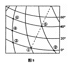 37、图9中虚线是地球公转到近日点附近的晨昏线,①点以西是东半球,以东是西半球,①点与②、③两点间的最短距离是3330km,回答下列问题:(20分)