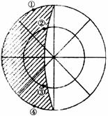 2004年3月22日到4月3日期间,可以肉眼看到多年难遇的“五星连珠”天象奇观。其中水星是最难一见的行星。观察者每天只有在日落之后的1小时内才可能看到它。在右图中阴影部分表示黑夜,中心点为极地。据此回答3-4题。