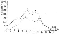(2)根据乙图中的信息,分析乙图中温州降水量线中A、B两高峰与贵阳降水量线中C、D两高峰形成原因的异同。(12分)______________________________________________