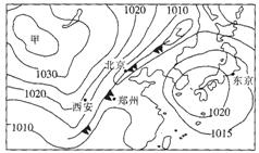 (3)简析甲图中的西安、郑州和北京此时的天气特征并说明原因。(12分)