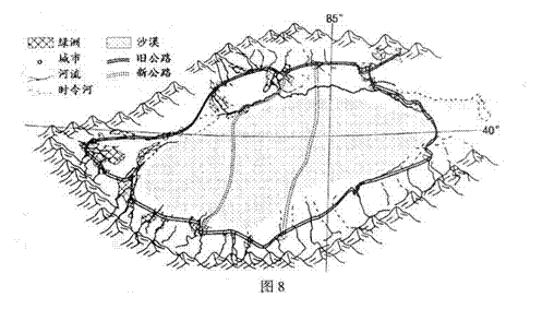 (1)填表比较图8中新旧公路的选线差异。(16分)