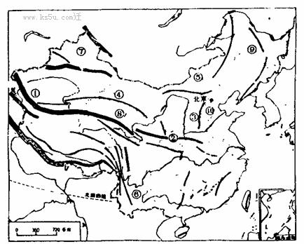 (2) 山脉往往成为我国省级行政单位的天然界线,下图中各数码表示山脉的名称正确的是