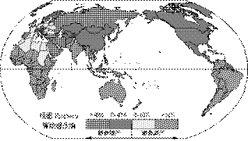 全球变暖是当今世界面临的重大环境问题之一。下图是“全球温度上升3℃后,世界不同区域靠雨水生长粮食产量的增减状况”示意图,读图回答第8~9题。