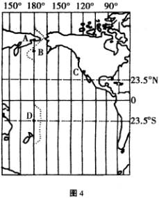 36.读图4,D地此时是一年中太阳高度最小的正午,此时一艘轮船从A地出发,航行6小时后到达B地,然后又继续航行10天,到达目的地C地(32°N)。分析回答以下各小题:(15分)