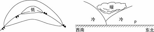在锋面气旋中,由于冷锋的移动速度较快,冷锋追上暖锋而形成的天气系统称为锢囚锋,读下面锋面气旋(图2)与锢囚锋的剖面(图3)示意图,回答3-4题。