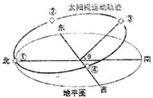 下图示意为在某地一天中所看到的太阳运动轨迹(太阳视运动轨迹),该地这一天太阳至③位置时的太阳高度角最大(θ为42°)。读图回答9-11题。