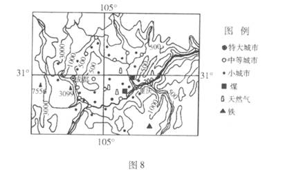 (1)简述图中中等城市的分布特点,并写出长江对重庆形成和发展的作用。(6分)