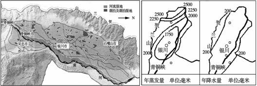 材料二:“银川平原湿地分布图”和“年蒸发量和年降水量分布示意图”