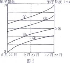 方。图5为四地6月22 E1,12月22 El等高旗杆正午影子变化示意图。回答9-11题。